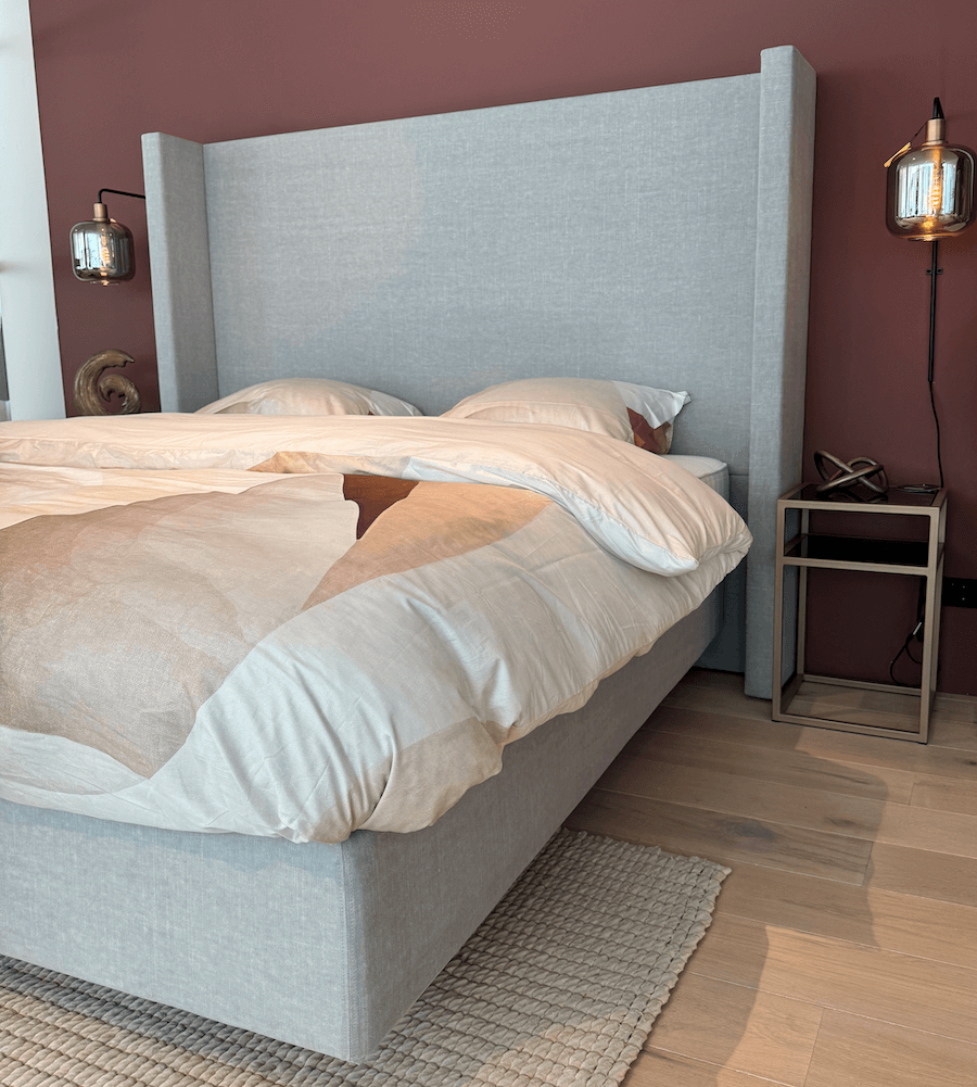 Een luxe Avek boxspring met vele extra’s zoals een extra dikke topmatras, gratis LED leeslampjes en gratis in- en uitstapverlichting.